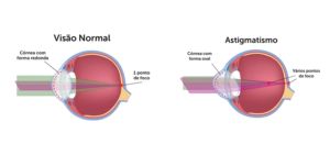 O astigmatismo é um erro refrativo que ocorre quando a córnea ou a lente do olho tem uma curvatura irregular. Essa curvatura anormal faz com que a luz se refrate de maneira desigual, resultando em visão turva ou distorcida. O astigmatismo pode ser hereditário ou pode ser causado por uma lesão ocular ou por cirurgia prévia.
