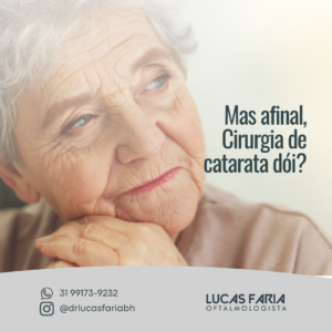 O paciente não sente dor durante a cirurgia da catarata. A anestesia é feita por colírio, e o paciente fica completamente confortável durante todo o procedimento, portanto não precisa de internação. O tempo da cirurgia leva em média 15 minutos. Na moderna cirurgia da catarata não é necessário pontos cirúrgicos e a recuperação da visão é quase imediata. O paciente pode sair da cirurgia caminhando e já enxergando.